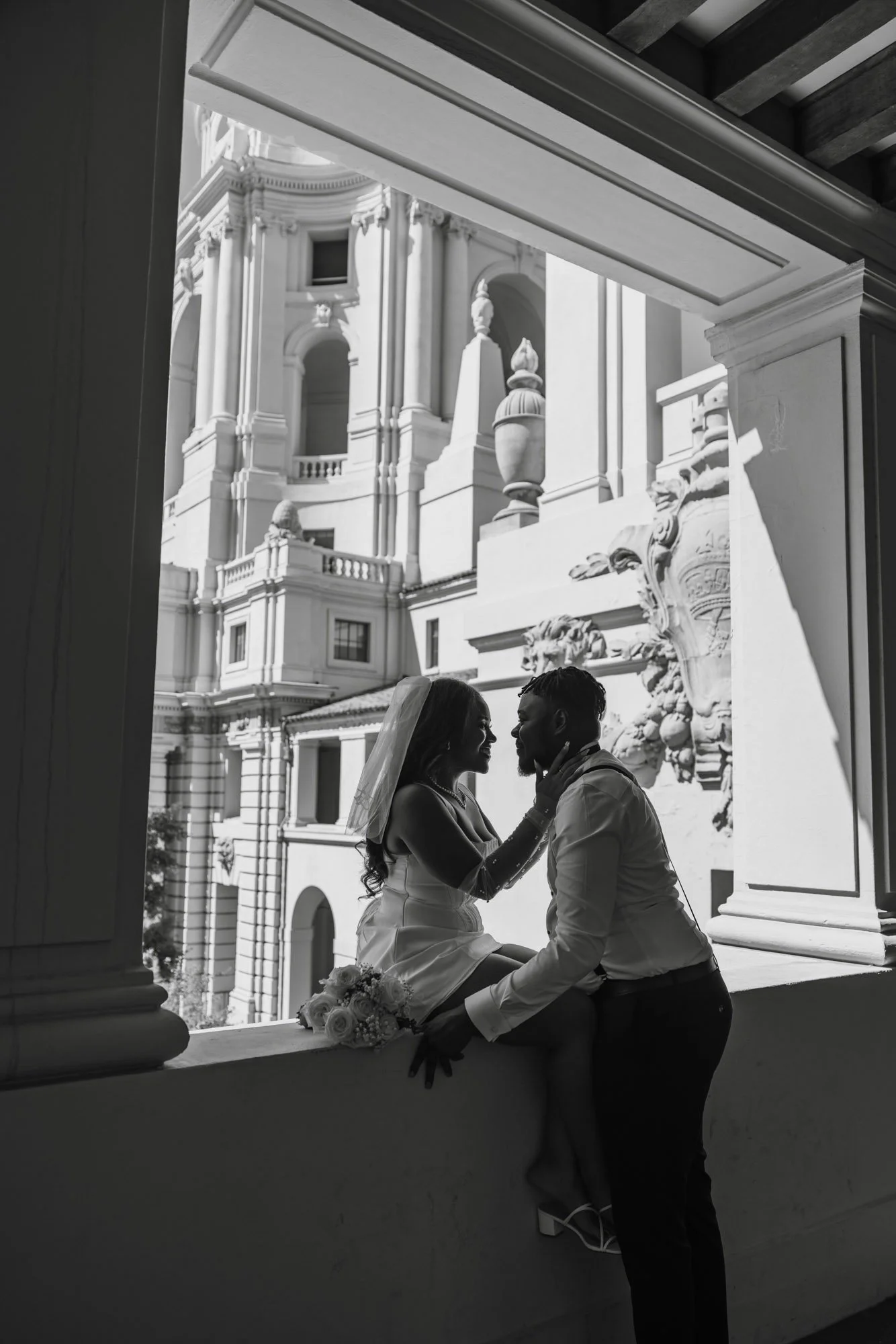 I love the opportunity to collaborate with couples who have a clear vision for their engagement photos, and K+S's inspiration was such a joy to bring to life. Combining the rebellious spirit of a "Bonnie and Clyde" moment with the intimate feel of an elopement, I was able to capture their timeless, joyful romance through a combination of playful candid shots with sophisticated, editorial-style portraits set against the backdrop of Pasadena City Hall.